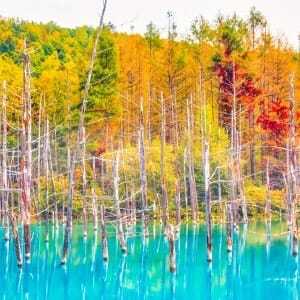 コバルトブルーの綺麗な水に無数の木が立ち並ぶ印象的な風景。秋には紅葉とのコントラストが最高です。写真を撮らずにはいられないスポットですね。