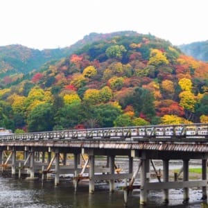 嵐山にたたずむ渡月橋。周りの山々の色鮮やかな紅葉をバックに、十二分に存在感をあらわします。