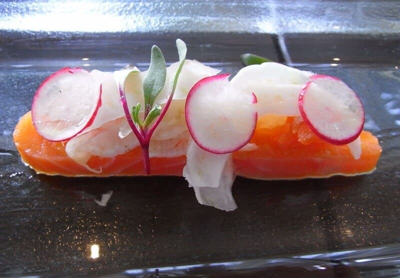 サーモンのコンフィの特徴として、オイルと相性の良いサーモンがしっとり柔らかく、口に入れると溶けてしまいそうなぐらい繊細さです。